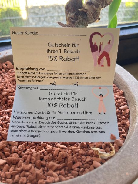 15 % Rabatt, wenn Sie eine Empfehlungskarte eines Stammgastes mitbringen.